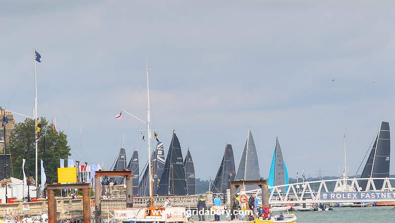 Black Group yachts had a reaching start from the Royal Yacht Squadron line, with a building west-going tide sweeping fleets across the line. Most fleets were therefore understandably line shy, although a few were hopelessly optimistic.