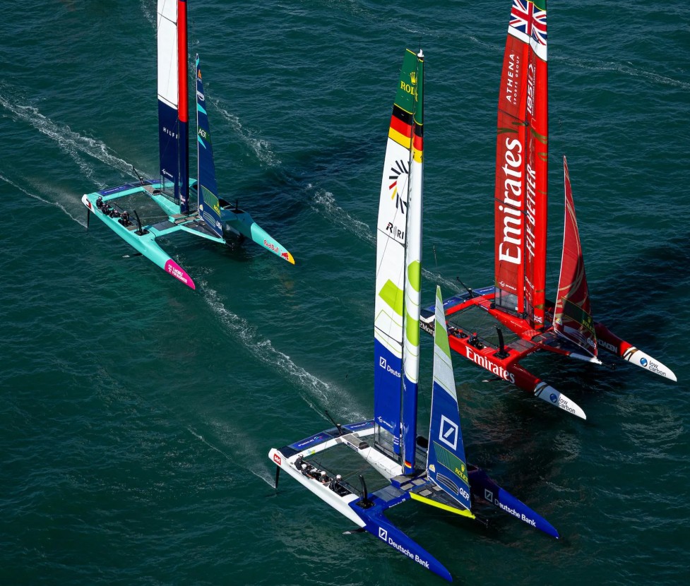 Germany SailGP Team presented by Deutsche Bank leads Emirates Great Britain SailGP Team, USA SailGP Team and Spain SailGP Team in action on Race Day 1 of the DP World Spain Sail Grand Prix © Felix Diemer for SailGP