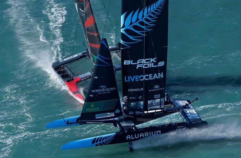 The first race of the day went the way of hometown favorites, the Black Foils, with New Zealand taking the lead on the start and finishing by overtaking France on the final mark to claim the opening victory on Lyttelton Harbour.