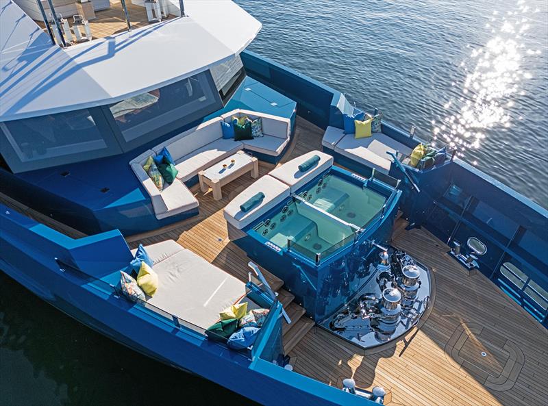 A 10-tonne crane allows the deployment of water toys from their stowage positions on the lower aft deck and with these removed the area becomes an expansive beach club. A Jacuzzi with dual temperature zones is hidden beneath sun pads on the bow and the yacht’s crowning jewel is a crow’s nest for magnificent 360-degree views.