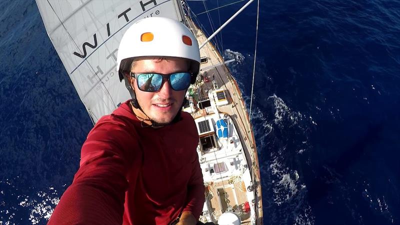 Never a dull moment onboard Galiana WithSecure with Anton up the mizzen mast checking the wind generator - photo © OGR2023 / Galiana WithSecure