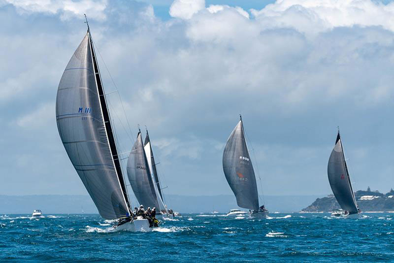 Alien, skippered by Justin Brenan from the Royal Yacht Club of Victoria (RYCV), was the first boat to hoist a kite, with the yellow spinnaker adding some colour to the fleet, but they struggled to carry it at times on the shy reach while other crews opted for code zeros and were able to make a higher course.