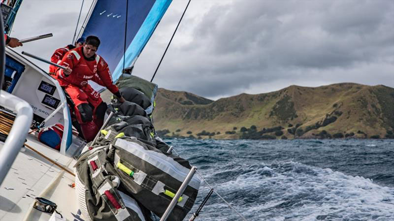 Leaving New Zealand - Volvo Ocean Race Leg 7 from Auckland to Itajai, Day 02 on board Vestas 11th Hour. Tom Johnson, stacking with Coromandel in the background - photo © Jeremie Lecaudey / Volvo Ocean Race