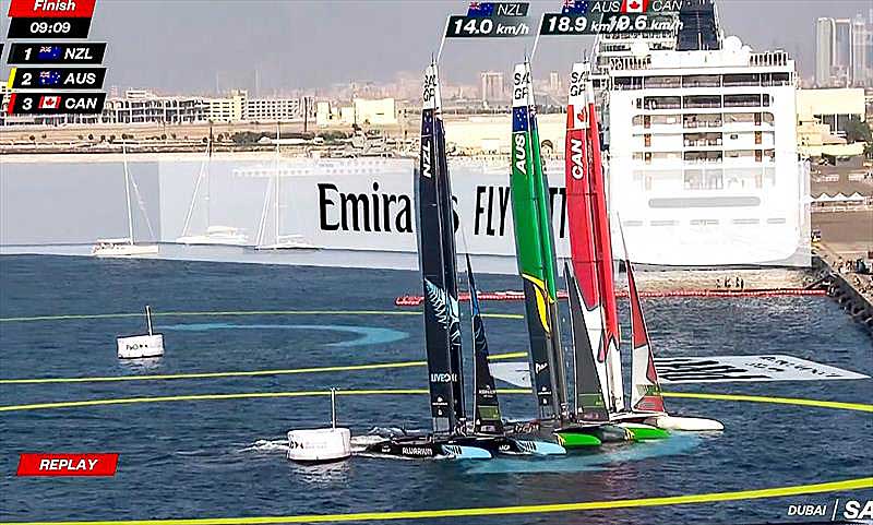 There was a major tactical play for the finish line as the two groups converged, both foiling. Australia and Canada had to sail the hottest angle to the mark – but without having to tack or gybe to make it.
