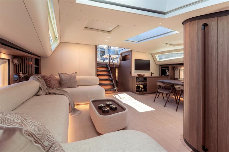 “Natural light is central to the atmosphere below deck, enhanced by large hull windows and the forward skylight.