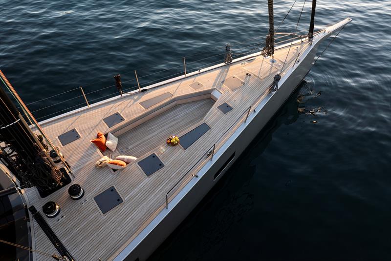 The foredeck has been customised with a recessed area for a 5.7 metre custom carbon tender. When it’s launched, the space converts into an additional lounging area, combining practical storage with outdoor living.