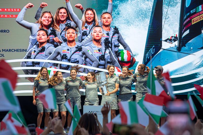 Accepting their award on the evening of Sunday October 13, 2024, on the main stage of the Race Village from the Puig Brand Ambassador, entrepreneur and model, Karlie Kloss, the Italian team raised the magnificent trophy in triumph and became beacons for the sport and icons to thousands of girls around the world who now have a clear pathway and target to make it to the apex of sailing—the America’s Cup.